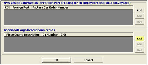 Click to create a AMS vehicle/additional cargo description. This will open the Vehicle/AMS Descs screen. |