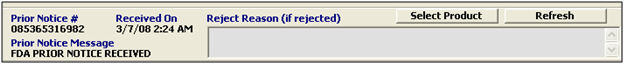 Displays the prior notice message. This will generally show either “FDA PRIOR NOTICE RECEIVED” or “FDA PRIOR NOTICE REJECTED” . |