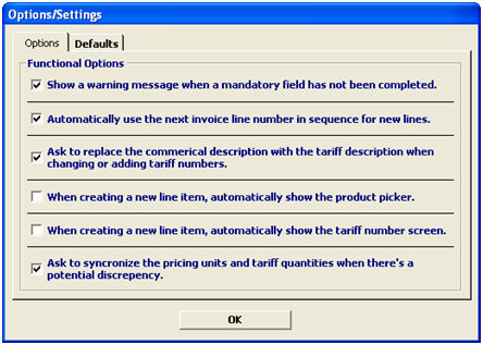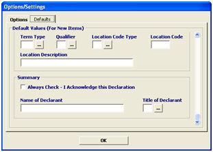 Open the Options/Settings screen, where you can activate options and settings. You can also enter AII defaults on this screen, which will be automatically entered on each new AII. |