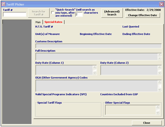 Please consult the screenshots below and the tables on the following page if you are uncertain of the meaning/purpose of a data or information field. This is the information that will display, based on the tariff search criteria. The screenshots below show examples of a tariff classification that has most of these fields in use. The first screenshot shows the Main information fields, and the second shows the Special Rates screen.