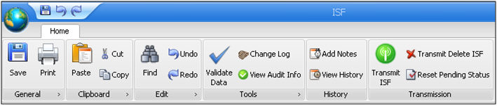 This section will cover the basic functions that are found in the toolbars of the various data entry screens of the CustomsNow ISF application. These menu options and controls are the same/similar throughout the CustomsNow application.