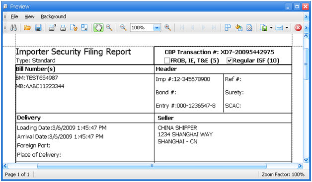 The print function will allow you to print an ISF data sheet, or export/email this information in a variety of formats. The CustomsNow Print Preview Window also features a variety of additional functions for managing this data sheet.