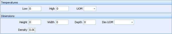 Enter the temperatures associated with this profile product. This section allows for the entry of a high/low temperature, as well as the selection of the temperature unit of measure. This information is generally kept for non-ambient shipments. |