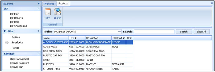 Click to search for an existing ISF profile product. You can use this to search existing products by a variety of data elements. |