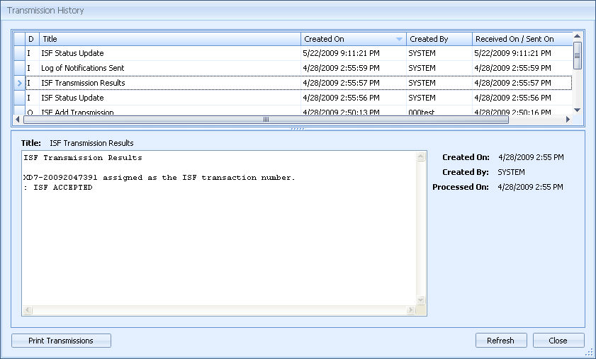 When you're ready to transmit your ISF, click on the Transmit button. When transmitting an update to an existing ISF, you use this same process and the update will automatically be sent as a "replace" rather than an "add"